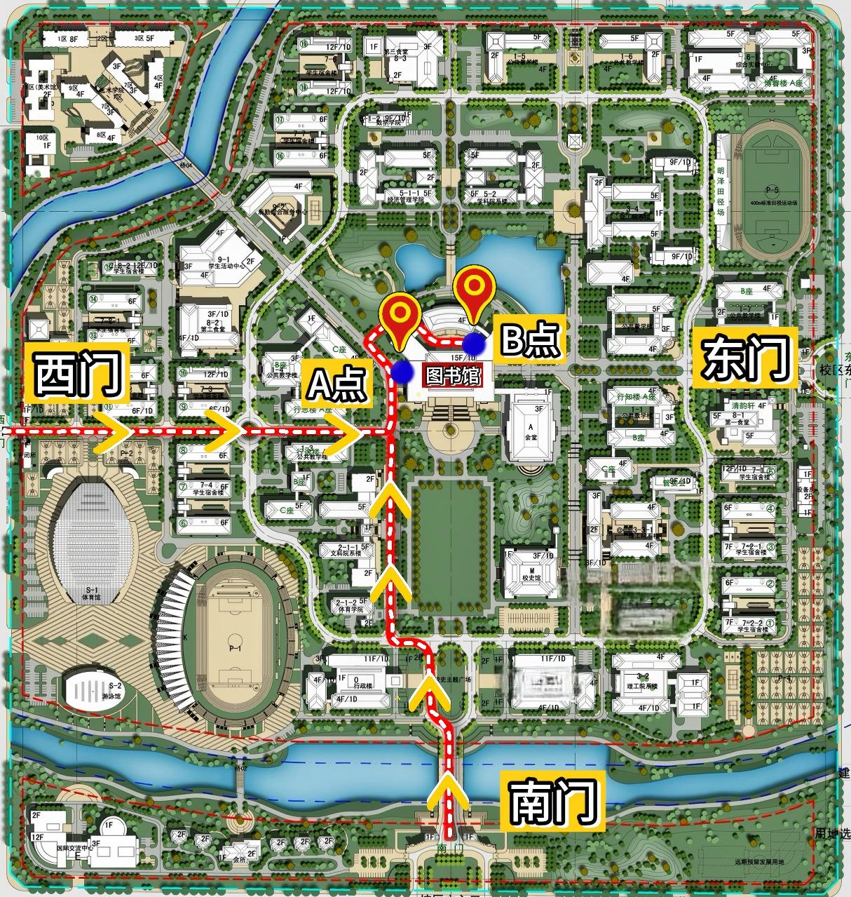 2. 我院办公场地已搬迁至图书馆13层、14层,具体路线可参考下图,由图中A点(图书馆西侧)或B点(图书馆东北角)两处乘坐电梯至13层参加复试,请考生提前熟悉路线,避免因走错电梯耽误时间影响复试。