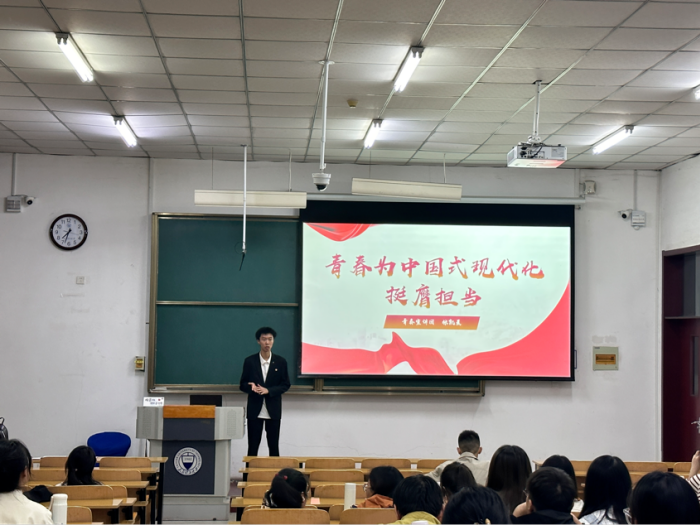 团课第二讲,校青马工程第四期青春宣讲团“领航学长”、思政2302班团支书张凯晨同学以“青春为中国式现代化挺膺担当”为主题,向学员们分享了自己在暑期“三下乡”社会实践的经历和体会,让学员领悟基层实践意义,激发学员们积极投身社会实践热情。